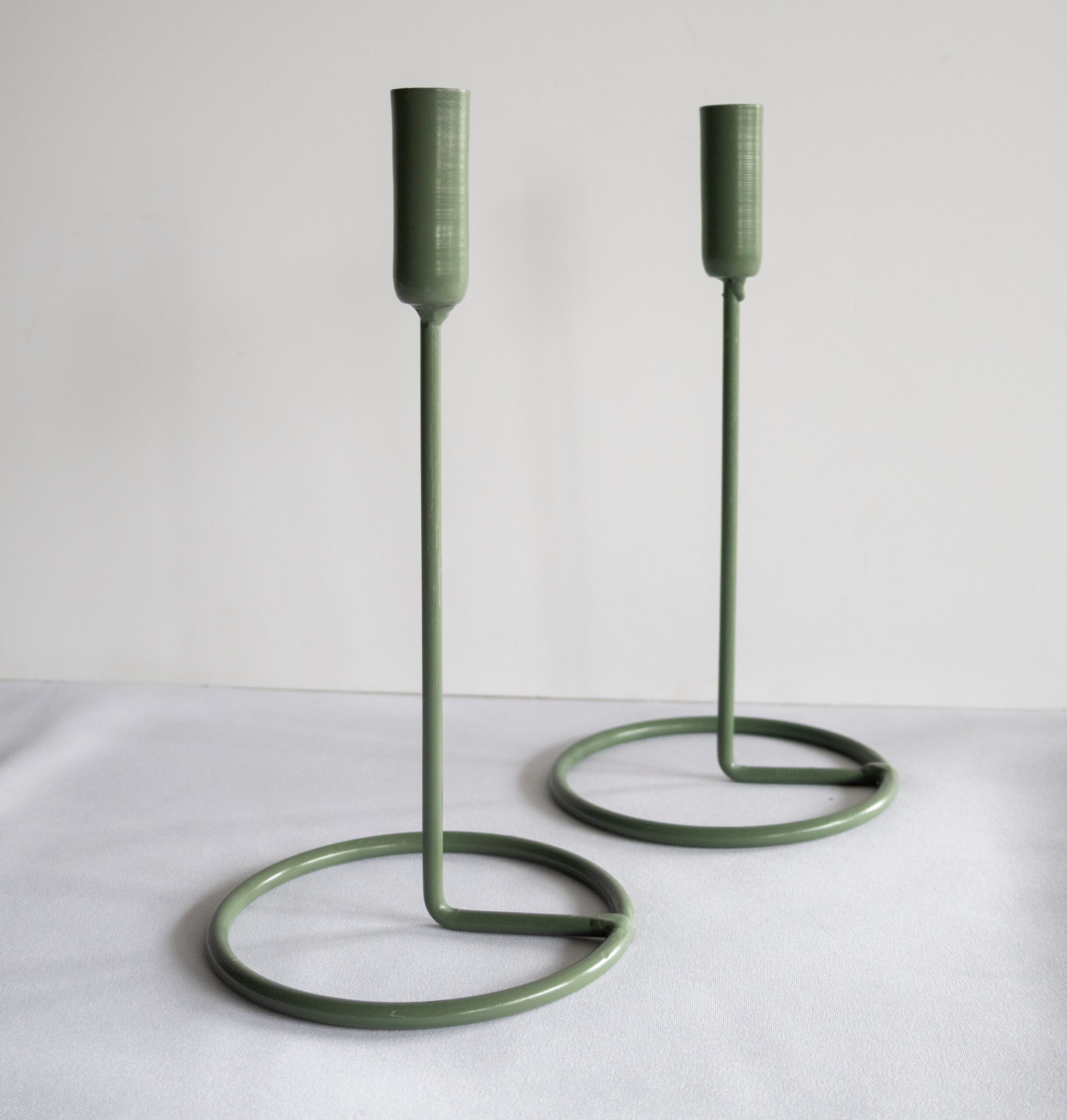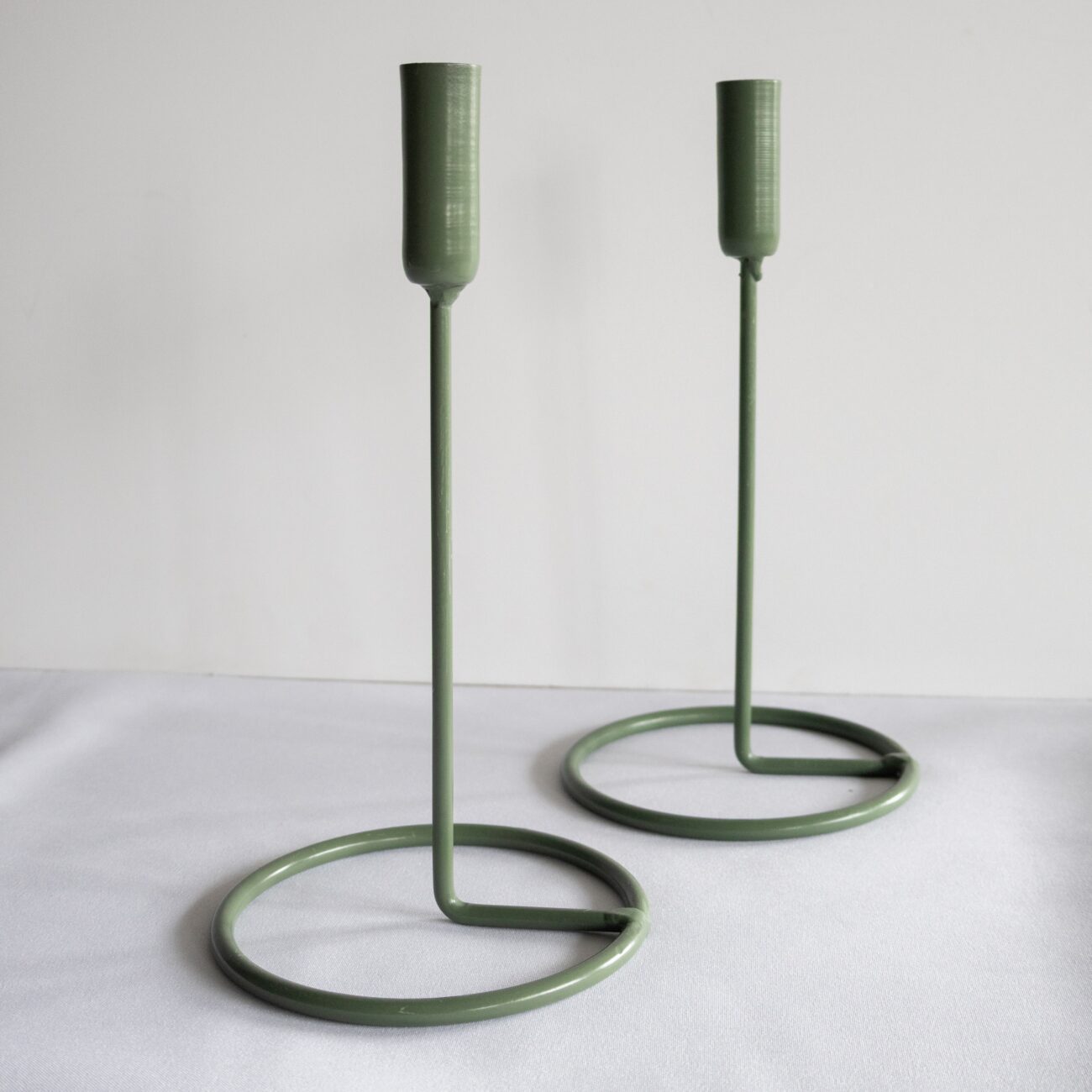 Dvojica vysokých kovových svietnikov v mentolovo zelenom odtieni prinesie do priestoru svieži farebný akcent a výšku.