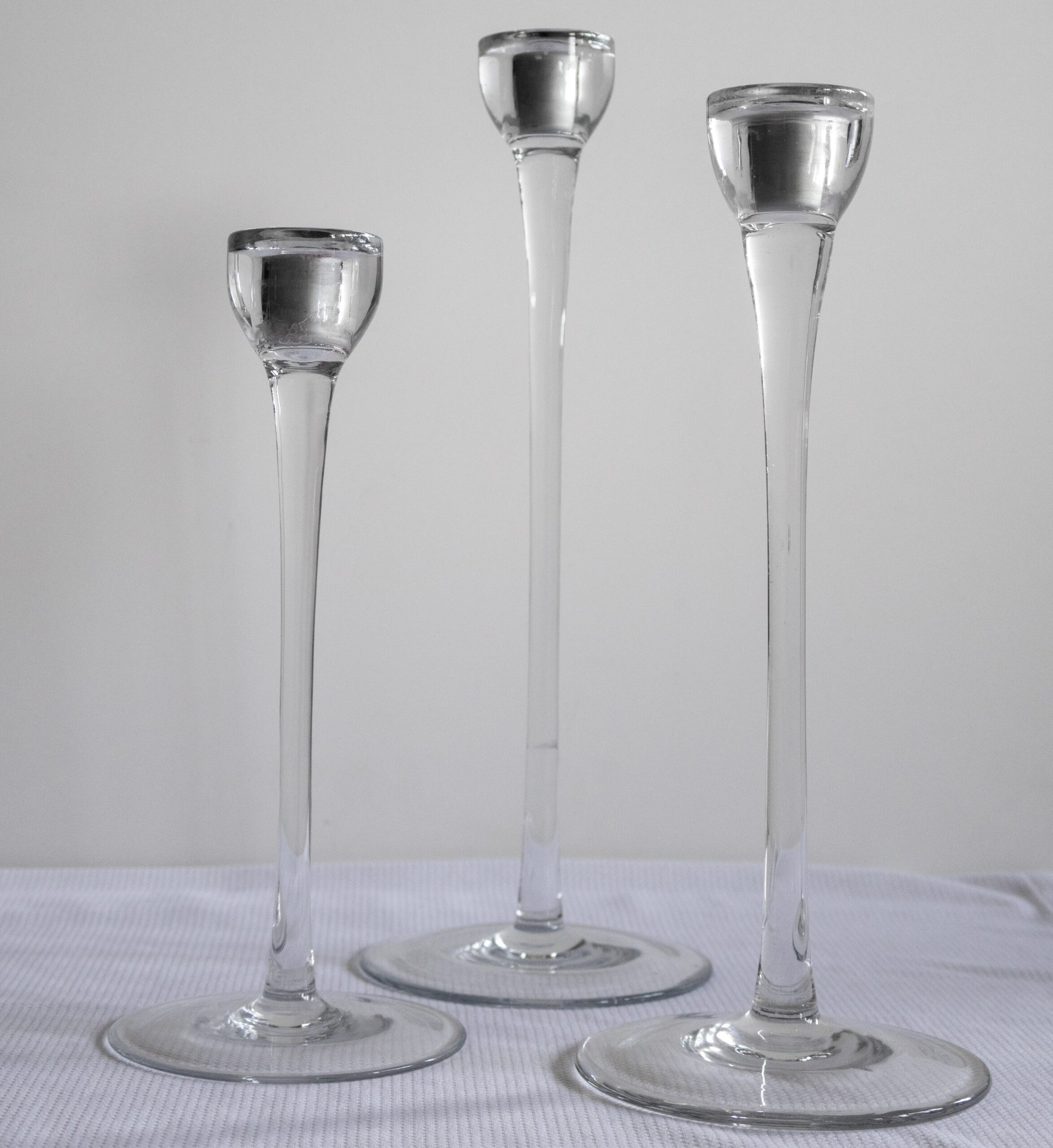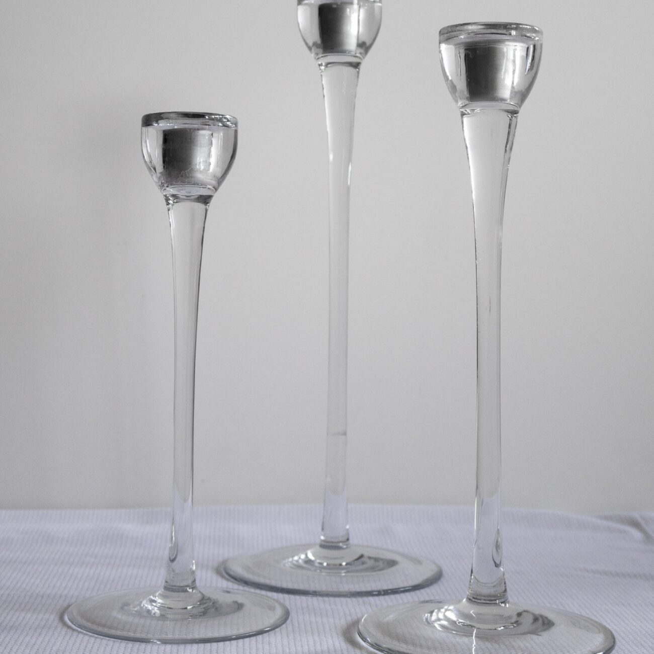 Vzdušné a elegantné svietniky zo skla v troch výškach – určené na kónické sviečky. Vytvoria vrstvený svetelný efekt bez rušenia celkovej výzdoby.